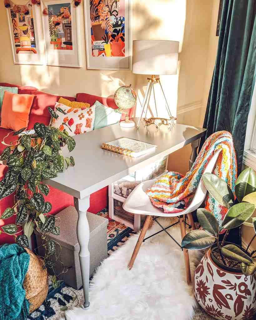One thing people often ask me about decorating with color is how to do it. I think the main issue with decorating with color is that people stop too soon! You actually need a couple of items that are colorful before the room will look cohesive. If you had one bright item, it will definitely stick out and look silly. However, if you have several bright items they can work together. I also find that two multi-colored items can give your room a color palette to work from. For example, when you look in this room you can see that the rug I chose has lots of colors, then you can see the artwork has lots of colors, and actually even the throw pillows have the pink, brown, orange, and cream. As a result of these three things the room feels full of color. All other items are really just solid colors that come from those items!