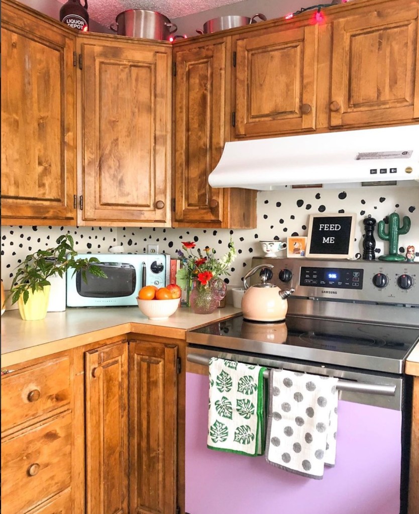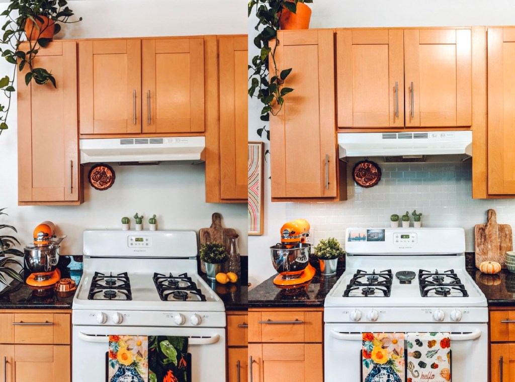 2. BACK SPLASH. Most kitchens I find myself drawn to have some type of back splash. You know what I’m talking about, beautiful tiles, cool marble finishes, bursts of color… Let’s contrast that with ever rental I’ve ever been in – there’s just the same color paint right behind the stove. No contrast, no tile, no interest. The back splash is an area that always elevates the kitchen space! In order to upgrade it, consider using something removable like peel & stick tiles, removable wall paper, picture frames, or paint!