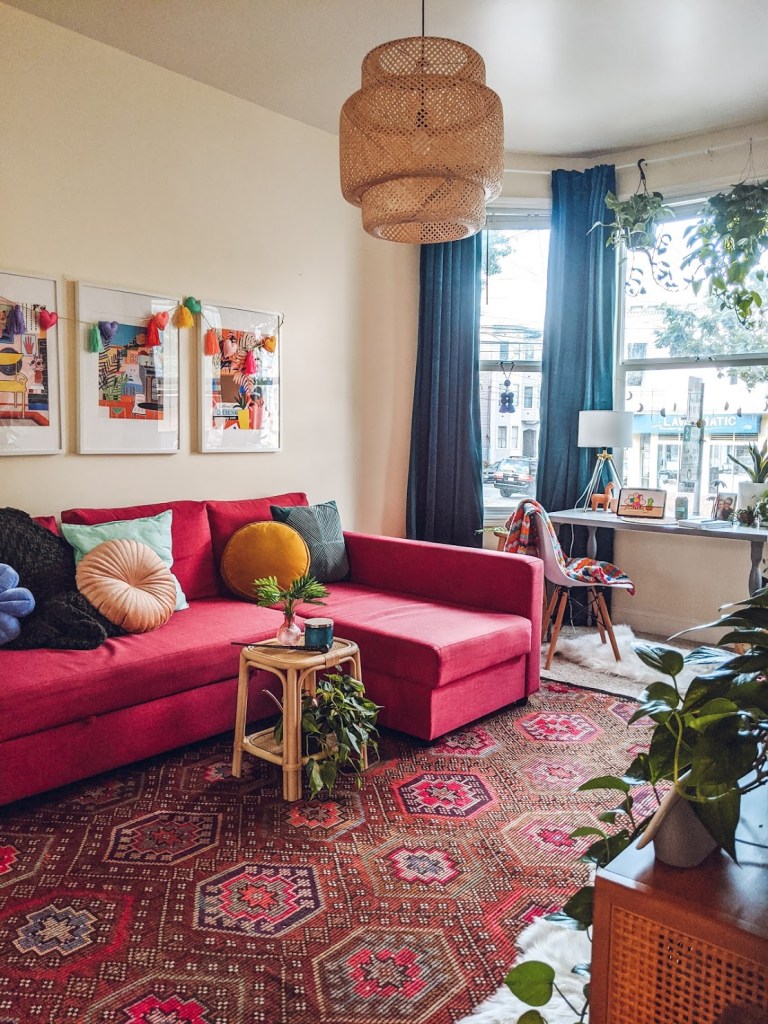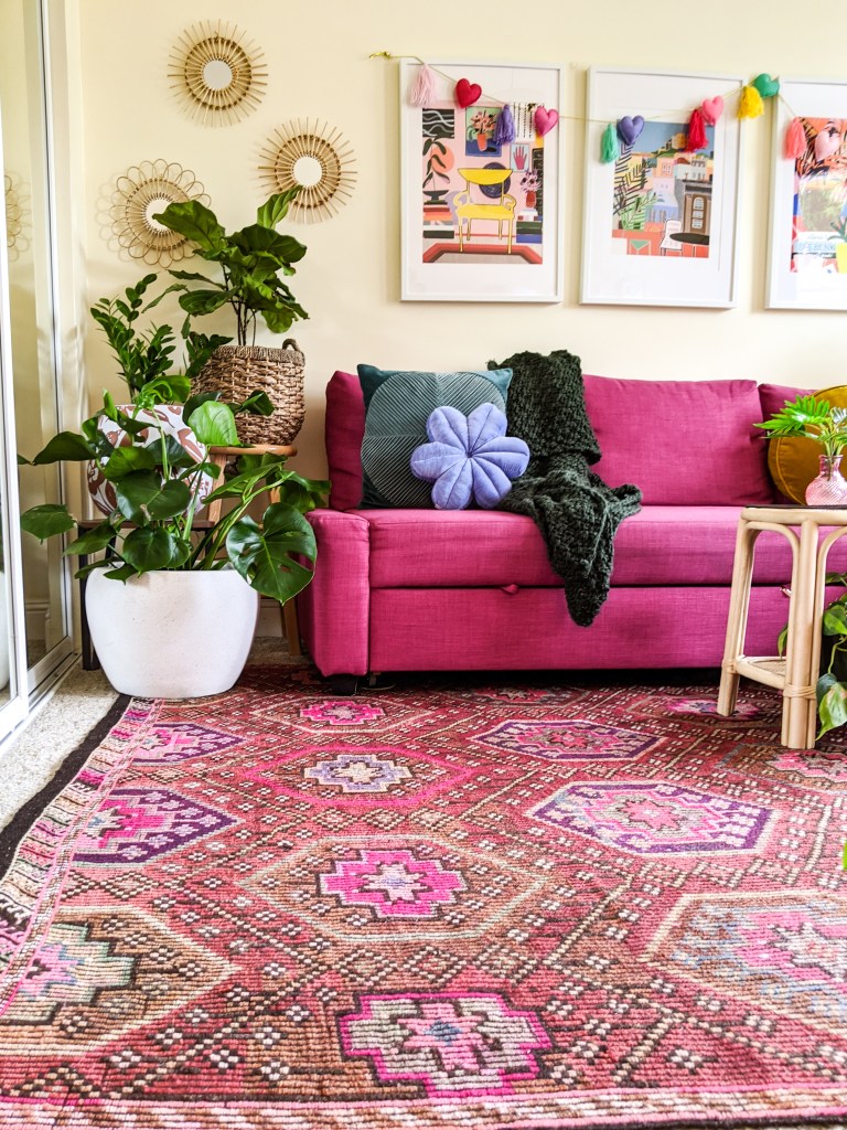 As soon as we moved in the goal was to get them covered! Enter countless hours of internet searching for the perfect area rug. Naturally, right away when folks see our home they notice our hot pink couch. This bold piece really drives the aesthetic of our living room! I absolutely adore the color of this couch and feel like I got so lucky that I was in the market for a couch and this one was available at Ikea. (Hello, budget option in a custom color look!)
