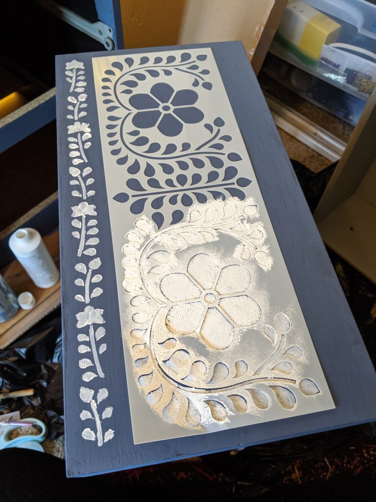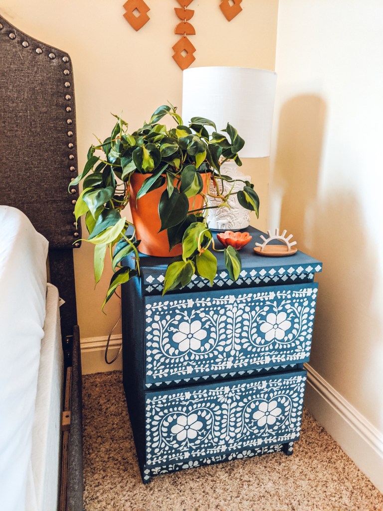 As you can see the original nightstand is quite boring, especially for our colorful bohemian space that we are creating! I found some inspiration pictures online. Fortunately, Michael’s had a stencil that matched my design and I purchased it! Link to the stencil: https://www.michaels.com/diy-home-bone-inlay-laser-stencil-set-by-artminds/10478855.html.