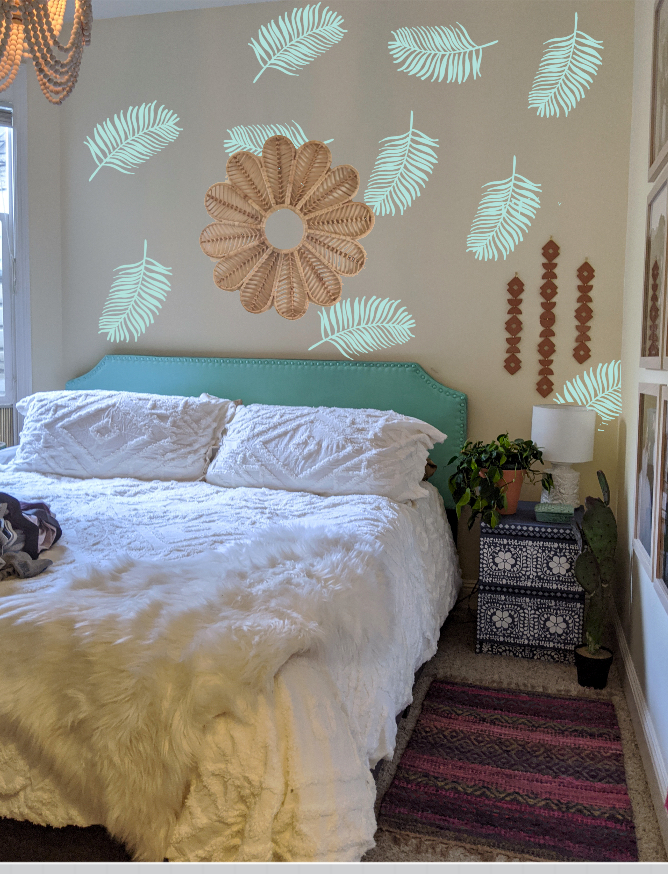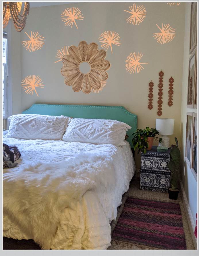 One idea I had would be to put up decals on the main feature wall. This would allow me to avoid having to paint or commit to a full wall paper, but would add a lot of visual interest to the room! Also, decals are usually not very expensive. For example, I found several of these designs for approximately $60. However, I haven’t found ones that I think are a perfect fit. I reached out to some brands to see if they could make a custom design, but I haven’t heard back yet. Here are the designs I mocked up on my ipad!