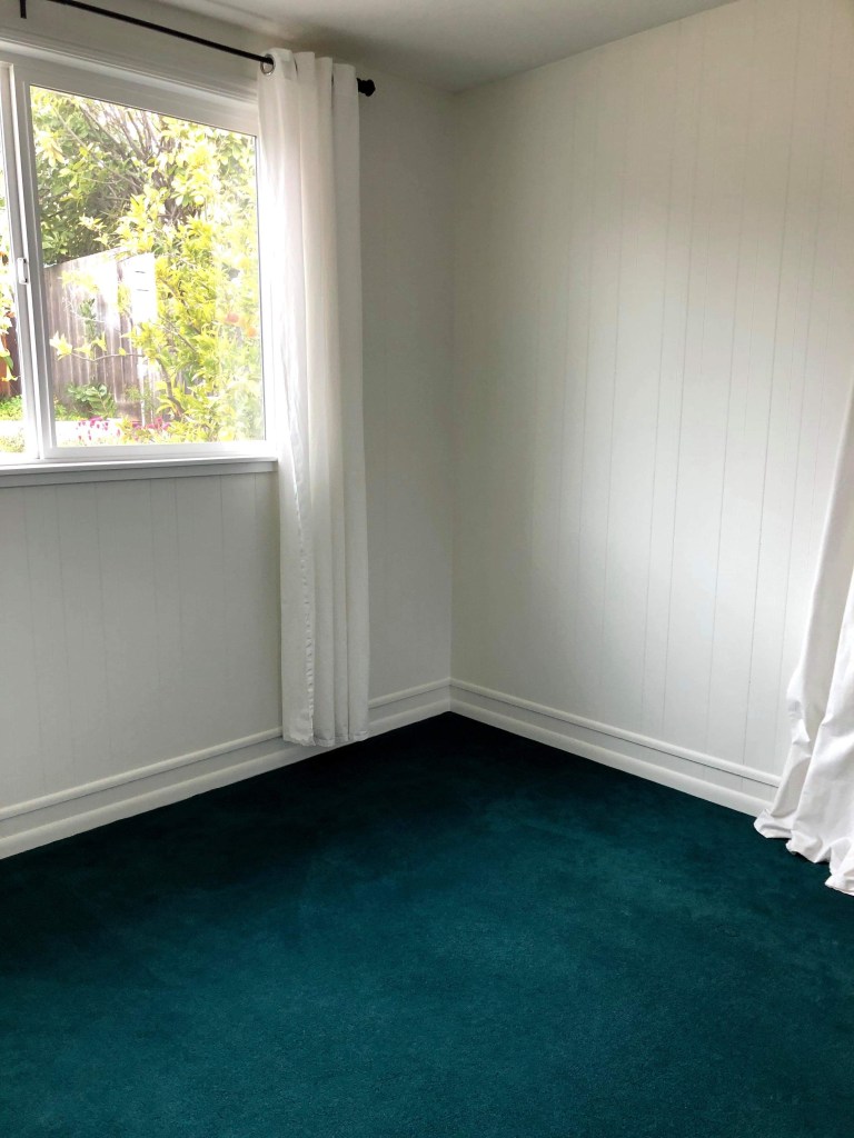I’ve never done a room makeover for anyone before so I was pretty nervous about how it would all come together. There were a couple of options for dealing with the flooring. 1) we could incorporate it into the design by choosing potentially a colorful rug, 2) try to cover up as much of it as we could, or 3) ignore it completely and do our own thing!