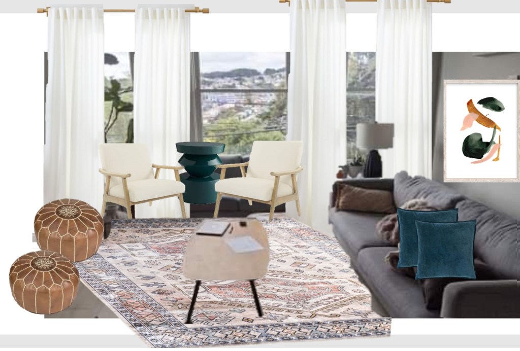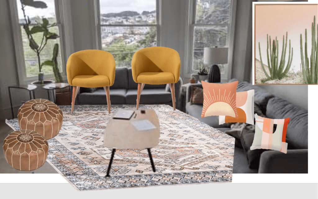 In this brainstorm, I left things somewhat neutral and only added color in with throw pillows and potentially a side table in a fun color.