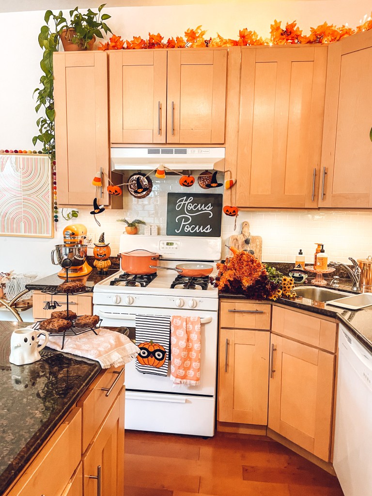 When thinking about how to decorate your kitchen, I like to focus on items that aren’t just cute but also serve a function! For example, by choosing a ghost oven mit, you’re able to decorate and also easily grab your Halloween themed baked goods easily. You can hang it on a hook near the stove and now you’ve got functional, cute, and in theme! Plus, those oven mits are super affordable!