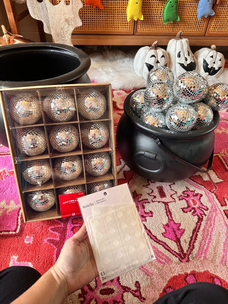 For an extra touch of magic, you can weave string lights into the disco ball bubbles. This will make your cauldron light up and shimmer, creating a bewitching ambiance. I skipped this step, but I actually think it’s worth going back and adding it because it’s so pretty to see it sparkle!