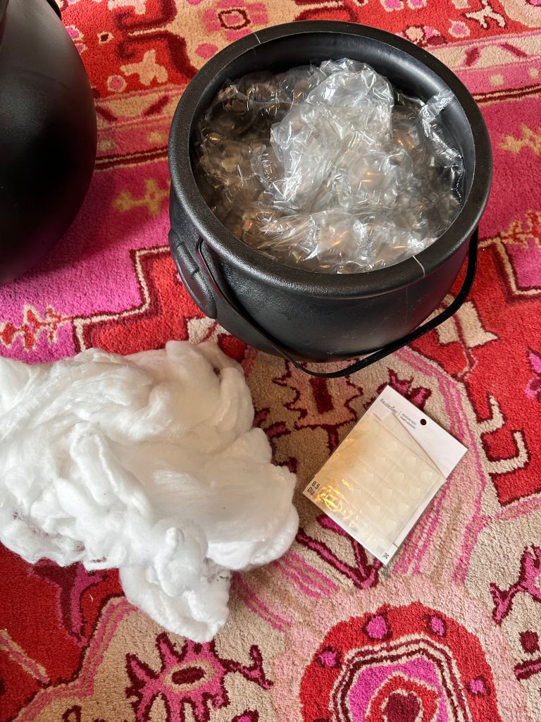 Also, in order to save on the cost of disco balls, go ahead and fill the cauldron up with stuffing, styrofoam, cardboard, etc. Anything you have lying around the house will work because it won’t be ruined by anything I did in this DIY. For me, I used leftover bubblewrap and filled the cauldron all the way up to the brim.